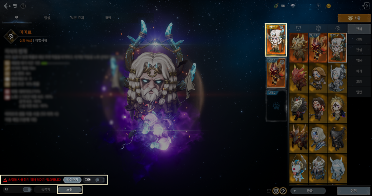 - 메인 슬롯에 장착한 펫은 먹이주기를 통해 24시간 동안 펫 스킬을 사용할 수 있습니다.