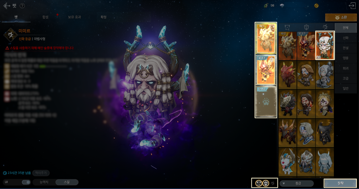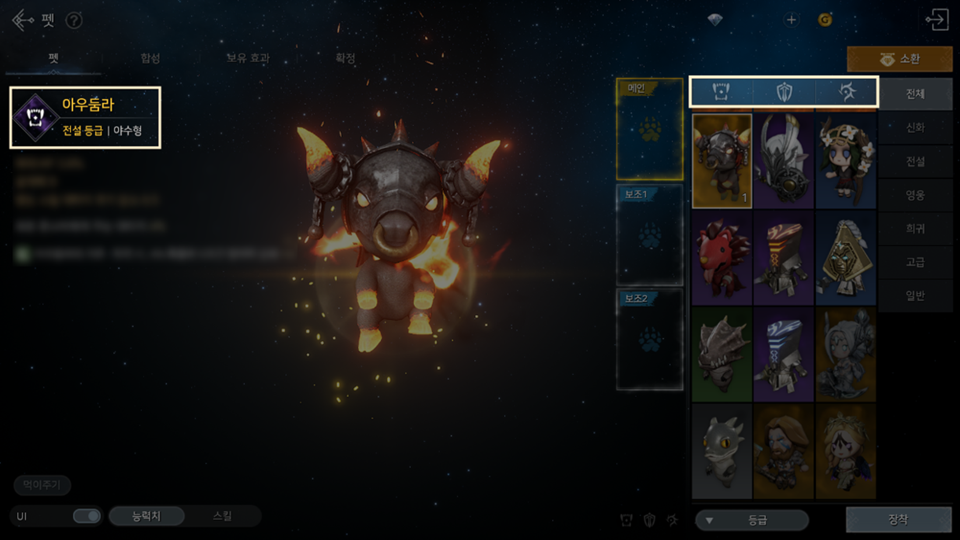 · 보조 슬롯에 장착한 펫은 액티브 스킬 사용이 불가하며, 능력치와 버프만 적용됩니다.