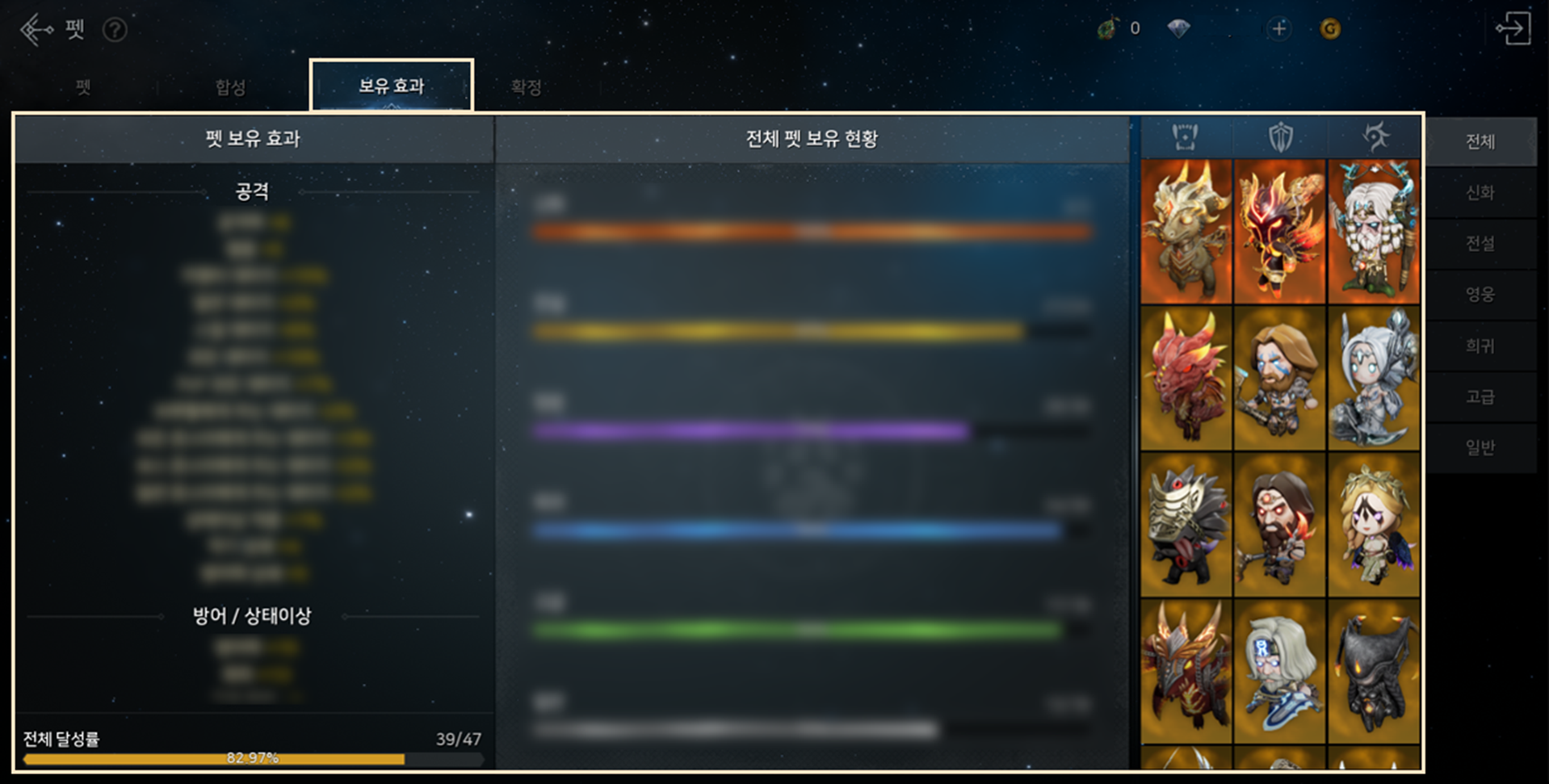 - 보유 효과 탭에서 전체 펫 보유 현황 및 보유 효과를 확인할 수 있습니다.