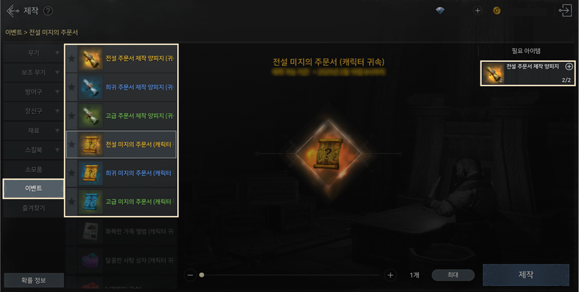 - 주문서 제작식은 [제작 - 이벤트]에서 확인하실 수 있습니다.