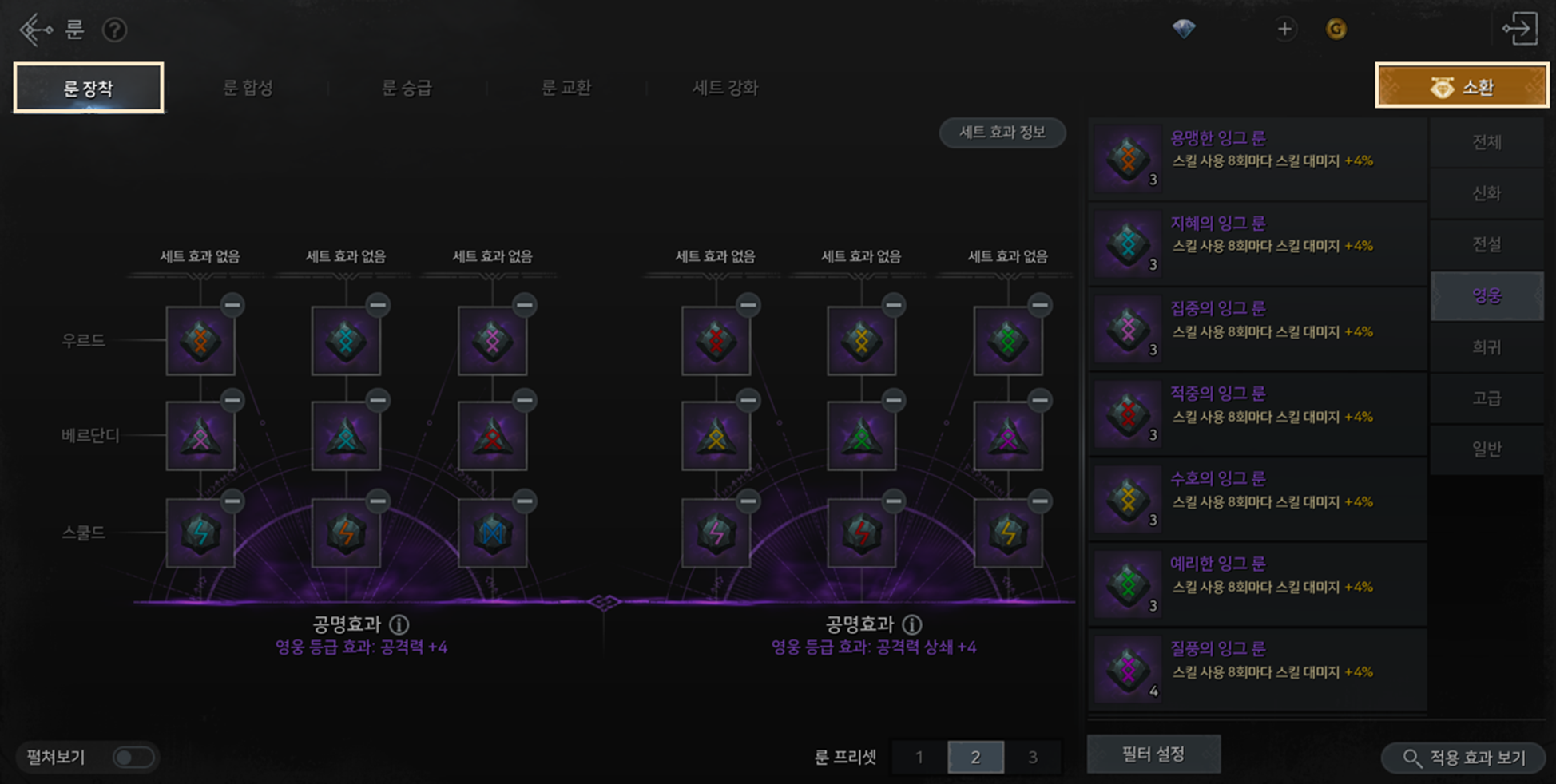 | 일반 ~ 희귀 | 최대 HP% 공격력 | 최대 HP% 방어력 | 최대 HP% 명중 |