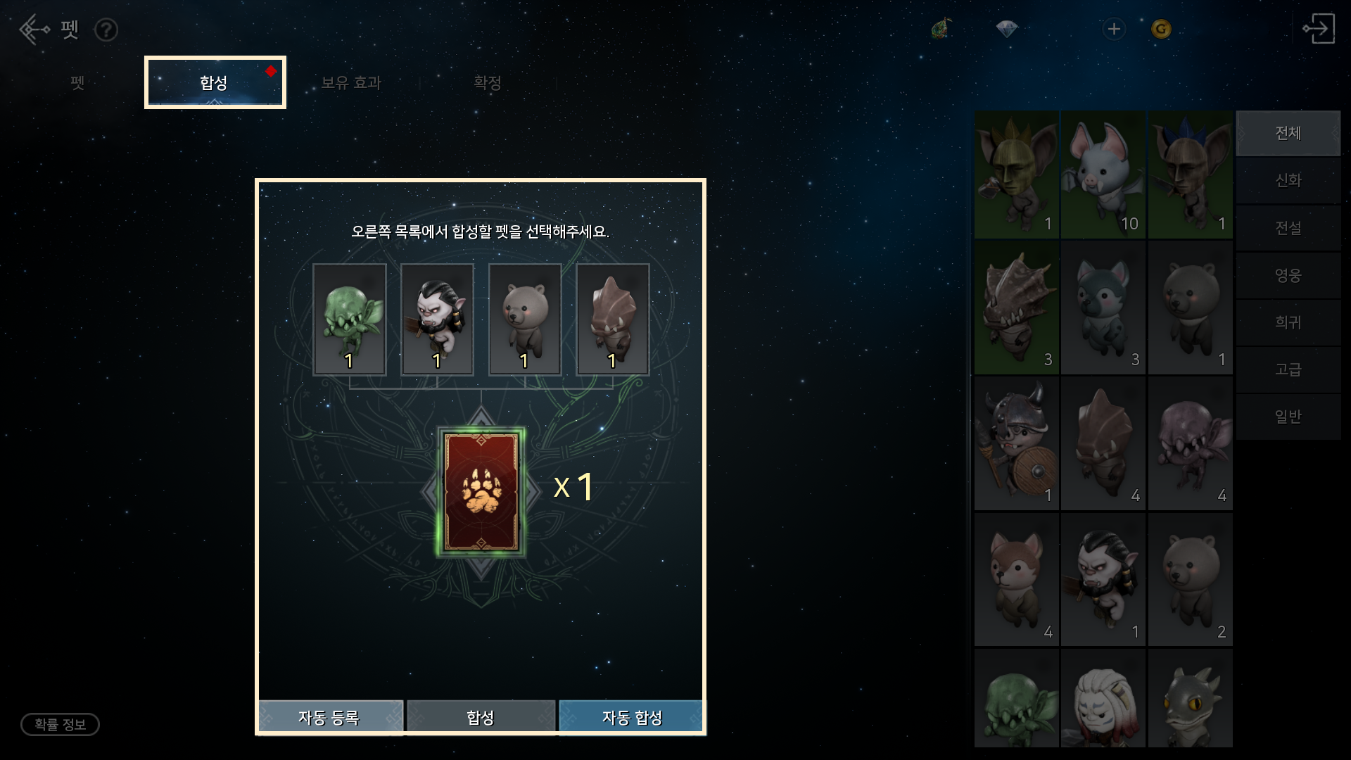 - 자동 합성 버튼 클릭 시 일반 ~ 고급 등급의 펫을 재료로 모두 합성합니다.