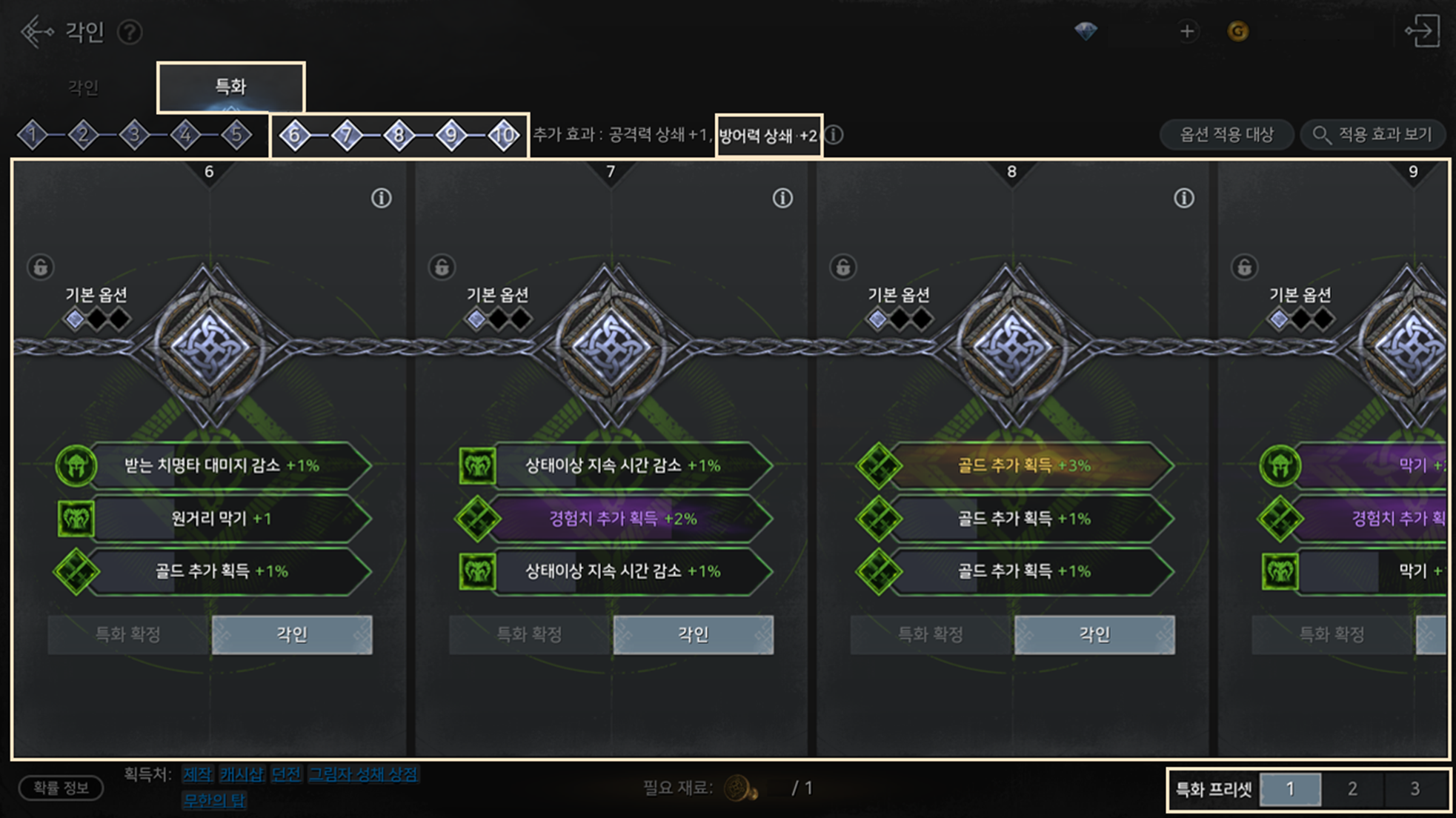 - 6~10번 슬롯 특화 확정을 모두 완료하면 획득한 옵션 중 가장 낮은 옵션의 등급에 따라 추가 효과를 얻을 수 있습니다.