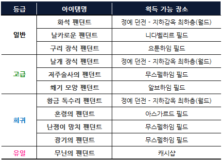 - 펜던트는 2~6챕터 필드와 [정예 던전 - 지하감옥 최하층(월드)]에서 일반 몬스터 처치 시 확률적으로 획득할 수 있습니다.