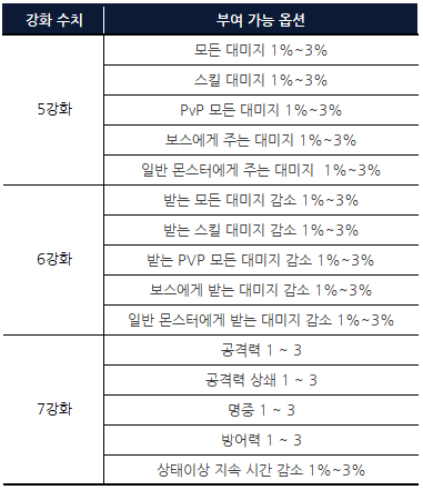 - 펜던트는 부적과 동일하게 5강화 ~ 7강화 시 부여 가능 옵션 중 1개의 옵션 및 수치가 지정된 확률에 따라 부여됩니다.