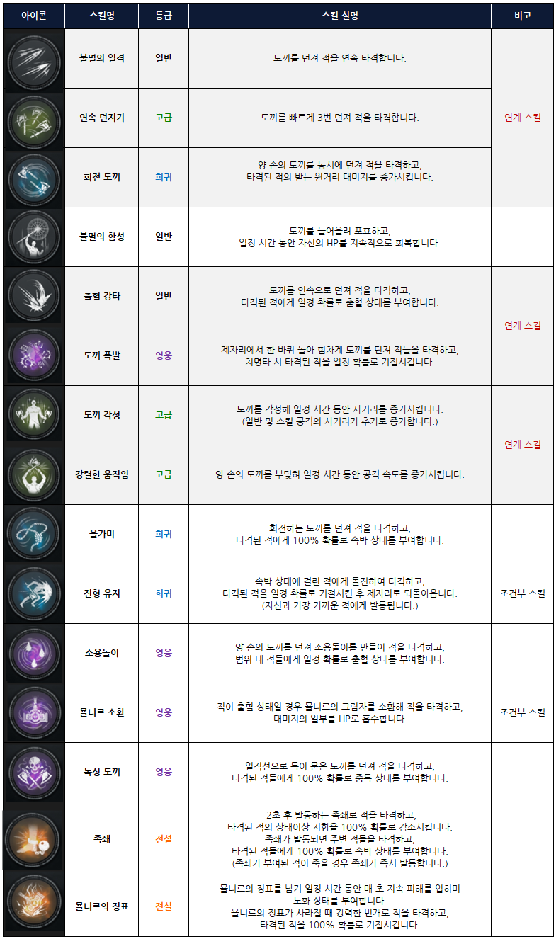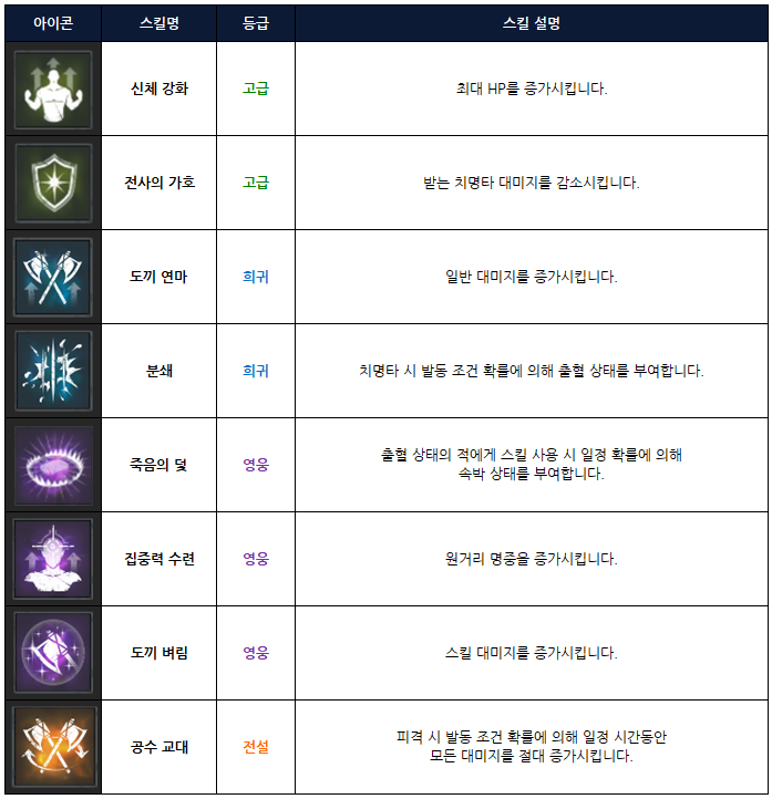 - 예리한 도끼날로 적에게 치명적인 출혈 상태를 부여하여 적을 제압하는 파괴적인 클래스입니다.