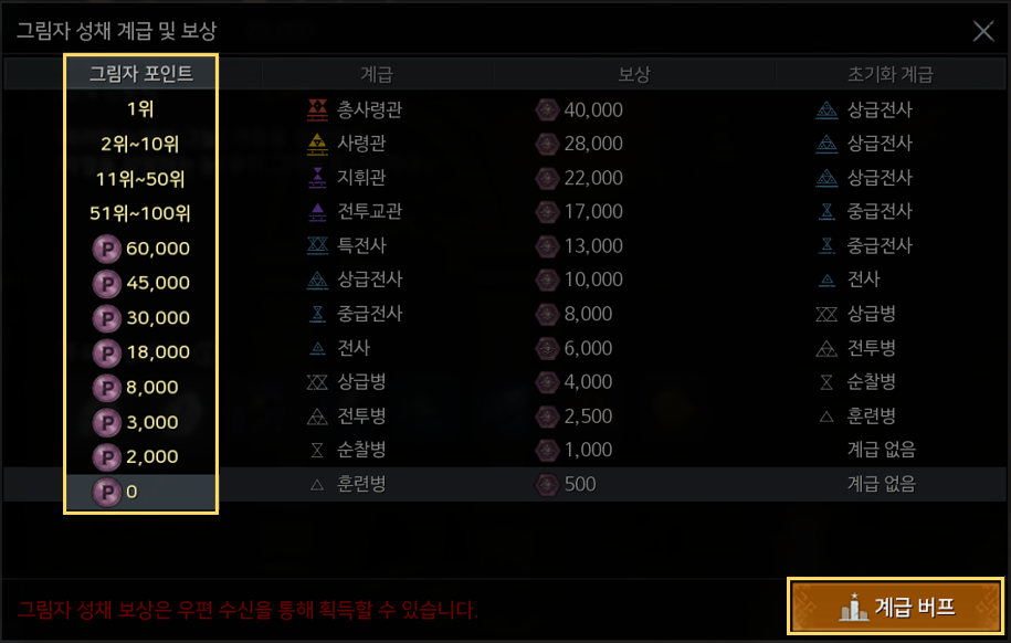 - 계급 버프 버튼이 추가되어 해당 버튼을 누르면 각 계급별 획득 버프 정보를 보다 잘 확인할 수 있도록 개선됩니다.