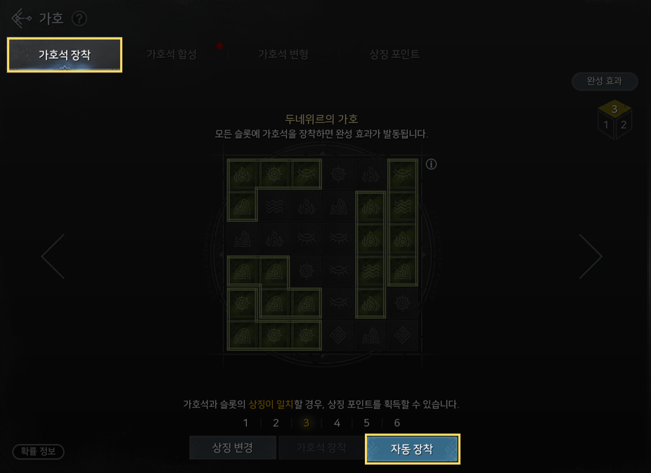 - 가호석의 옵션, 장착 시 상징 일치 수 등은 고려하지 않고 장착됩니다.