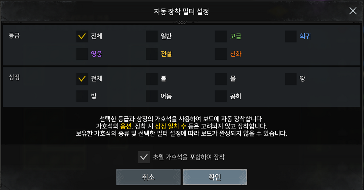 - 필터 설정에서 등급과 상징을 선택하면 해당 가호석이 자동으로 장착됩니다.