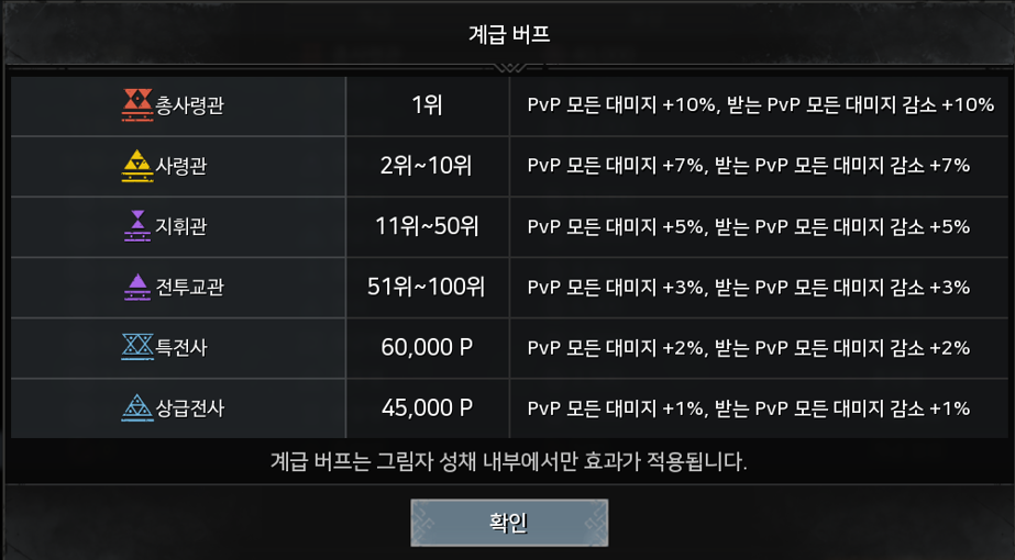 - 그림자 성채 계급 버프 명칭이 계급에 맞게 표시되도록 수정됩니다.