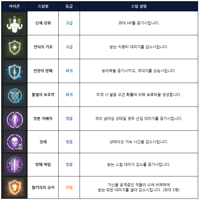- 발키리의 패시브 스킬은 받는 대미지와 상태 이상을 감소시키는 방향에 특화되어 있습니다.