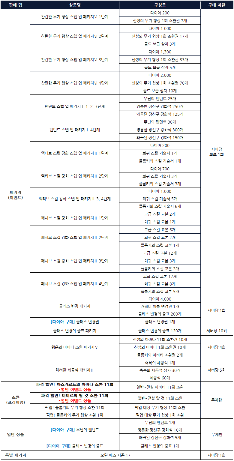 · 오딘 패스 [시즌 17] 프리미엄/무료 보상 획득 기간: 9월 28일(수) 점검 후 ~ 10월 12일(수) 07:59 (기간 만료 시 획득 불가)