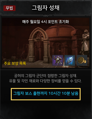 - 그림자 성채 입장 화면 UI에 그림자 보스 출현까지 남은 시간이 하단에 푸른색으로 표기됩니다.