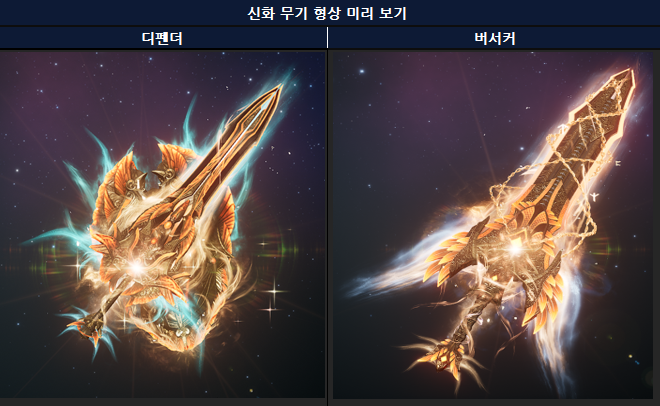 - 각 직업별로 신규 무기 형상이 추가됩니다. (영웅 2종, 전설 1종, 신화 1종)