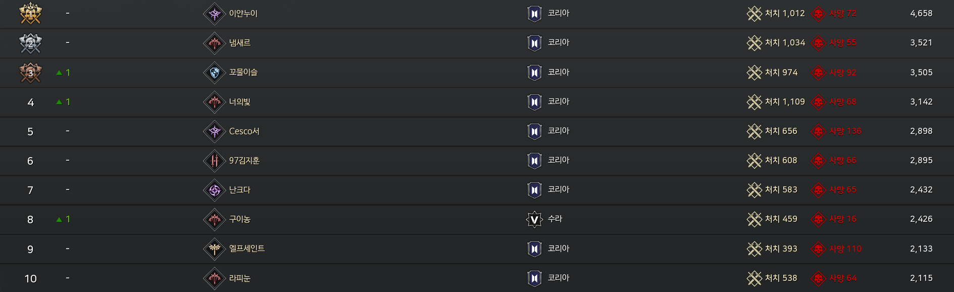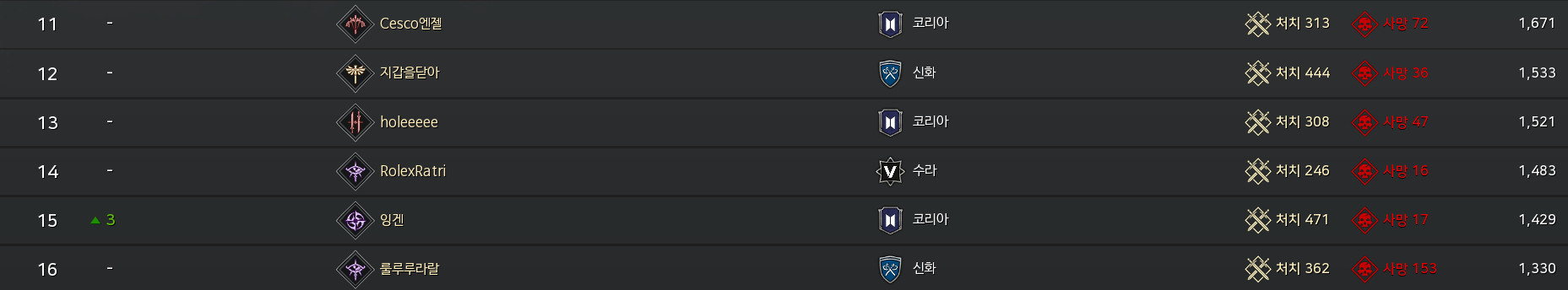그래서 지금 약 2주 정도 쟁이 진행됐고, PK순위를 열었을 때 상위권 유저들이 대부분 신화 캐릭터들임.