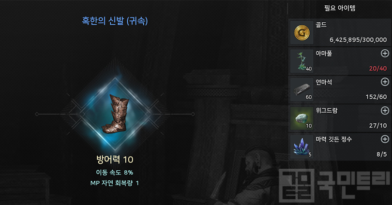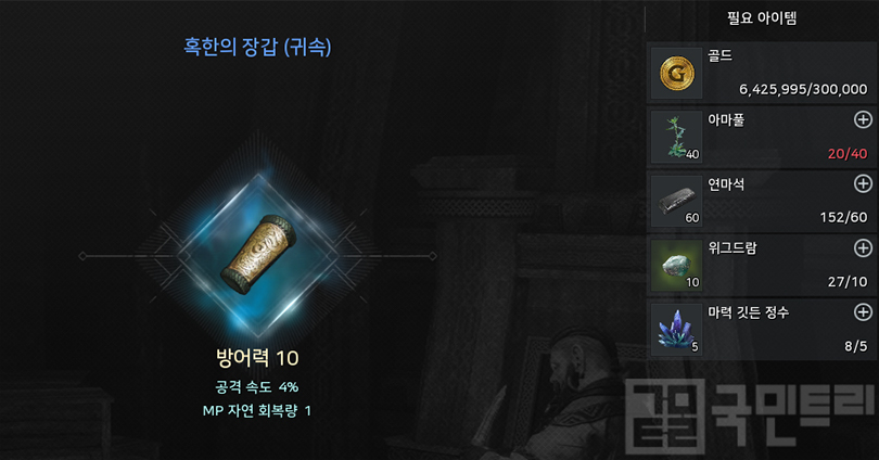 재료 중 그나마 입수 난도가 높은 건 마력 깃든 정수 10개 정도인데, 해당 재료를 드롭하는 필드 중 자신의 레벨보다 조금 낮은 곳에서 자동 사냥을 하면 조금씩 얻을 수 있다. 마을 의뢰 보상으로도 등장하니 의뢰를 고를 때 마력 깃든 정수가 보상 목록에 있는지 확인한 후 우선 진행하자.