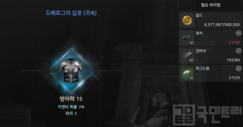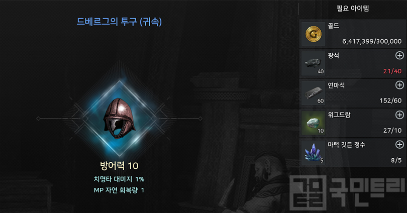 마찬가지로 필요 재료 중 마력 깃든 정수의 입수 난도가 제일 높다. 같은 등급인 ‘발키리의 전투 투구’는 해당 재료 없이 제작이 가능하지만, 옵션이 치명타 대미지 5% 하나 뿐이고 방어력도 고급 장비인 ‘검은 모래 투구’와 비슷하다. 희귀 장비를 맞출 거라면 ‘드베르그 투구’를 염두에 두고, 그전까지는 고급 등급 ‘검은 모래 투구’를 강화해 사용하자.