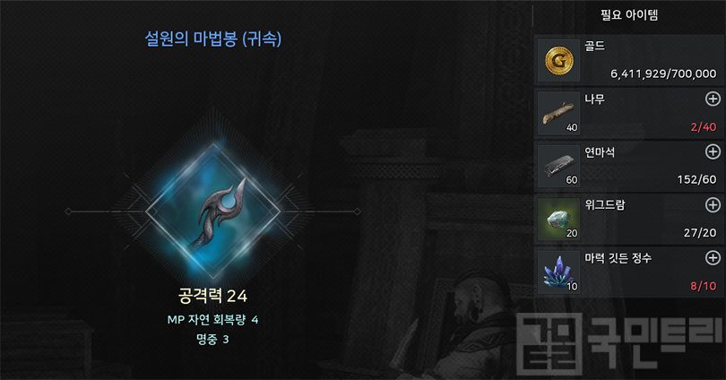 제작으로 얻을 수 있는 희귀 무기는 ‘푸른 서슬’, ‘설원’, ‘발키리’의 세 종류다. 여기서 가장 추천하는 건 설원 시리즈다. 제작에 필요한 재료 수급이 비교적 쉽고, MP 자연 회복 4와 명중 3이라는 알짜배기 옵션이 붙어있기 때문이다. 제작에는 골드, 나무, 연마석, 위그드람, 마력 깃든 정수가 필요하다.