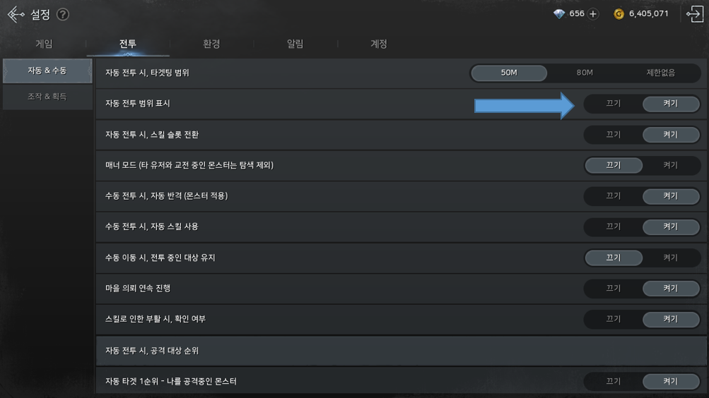 자동사냥 범위 보는 법은 설정에서 자동 전투 범위 표시하면 됩니다.!