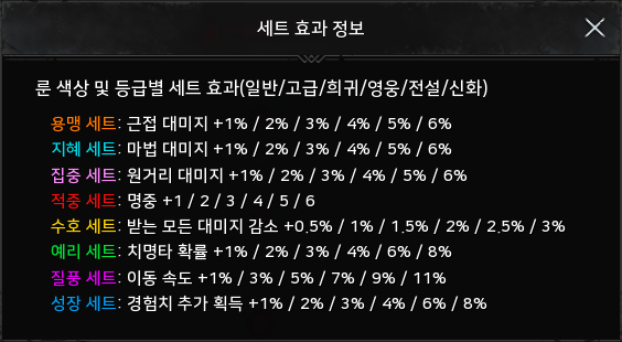 예를 들어 희귀 2개, 고급 1개의 적중 룬을 착용했다면 고급 등급 세트 효과인 명중 +2를 얻는다. 우선 육성 초반에는 등급과 상관 없이 같은 색 룬을 착용하고, 이후 룬 합성이나 승급을 통해 상위 효과를 노리자.