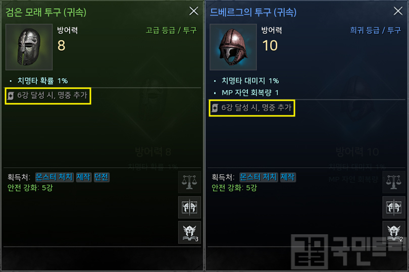 무기와 투구는 안전 강화를 넘겨야 하는 만큼 파괴 리스크가 있다. 따라서, 투구의 경우 육성 초반에는 고급 등급 +6 강화를 달성을 추천한다. 수급이 원활해 파괴 리스크가 비교적 적고, 희귀 등급 장비와 방어력, 옵션 차이도 크지 않기 때문이다. 반면, 무기는 기본 옵션에서 제공하는 명중 수치가 있어 고급보단 희귀 등급이 훨씬 효율이 좋다. 희귀 등급 무기를 우선 제작해 +5 강화 상태로 사용하고, 실패에 대비해 제작 재료를 모두 모은 뒤 추가 강화를 노리자.