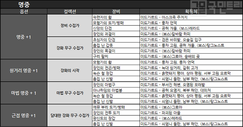 ▲ 미드가르드에서 완성하면 좋은 명중 ‘아이템 수집’ 목록 (자료: 국민트리 제작)