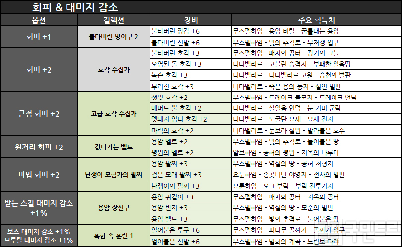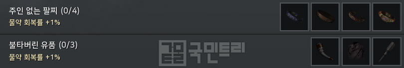 여기서 안전 강화 이내로 달성할 수 있는 수집이 2개 있다. 이를 통해 물약 회복률 +2%를 확보 가능하다. 참고로 ‘주인 없는 팔찌’는 ‘불타버린 팔찌’만 무스펠하임에서 등장해 달성이 비교적 쉽다. 이 외 기타 아이템 수집들도 안전 강화에서 1단계 더 높은 강화를 요구해 공격, 방어 대비 달성해 볼 만하다.