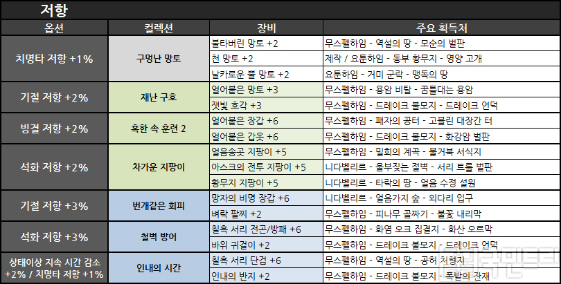 무스펠하임 신규 장비 아이템 수집 중 방어력을 제외한 기타 방어 관련 항목은 총 14개다. 회피 관련 수집이 5개, 대미지 감소 2개, 저항 관련은 7개다. 고급 등급 수집인 ‘차가운 지팡이’의 경우 방어 옵션에서 유일하게 안전강화 이내로 달성 가능하다. 달성 시 ‘석화 저항 +2%’를 얻으며, 필요 장비 3개 중 무스펠하임에서만 얻을 수 있는 장비는 1개 뿐이라 달성 난도가 낮은 편이다.