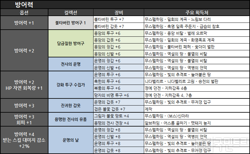 무스펠하임 신규 장비 아이템 수집 중 방어력이 상승하는 건 총 7개다. 모두 달성할 경우 방어력 +17을 누릴 수 있다. 이와 더불어 HP 자연 회복량 +1, 회피 +1, 받는 스킬 대미지 감소 +2%를 얻는다.
