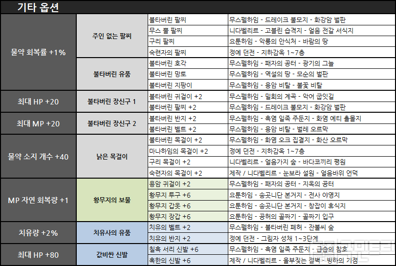 무스펠하임 신규 장비 아이템 수집 중 기타 옵션은 총 8개다. 모두 달성할 경우 물약 회복률 +2%, 최대 HP +100, 최대 MP +20, 물약 소지 개수 +40, MP 자연 회복량 +1, 치유량 +2% 효과를 손에 넣는다.
