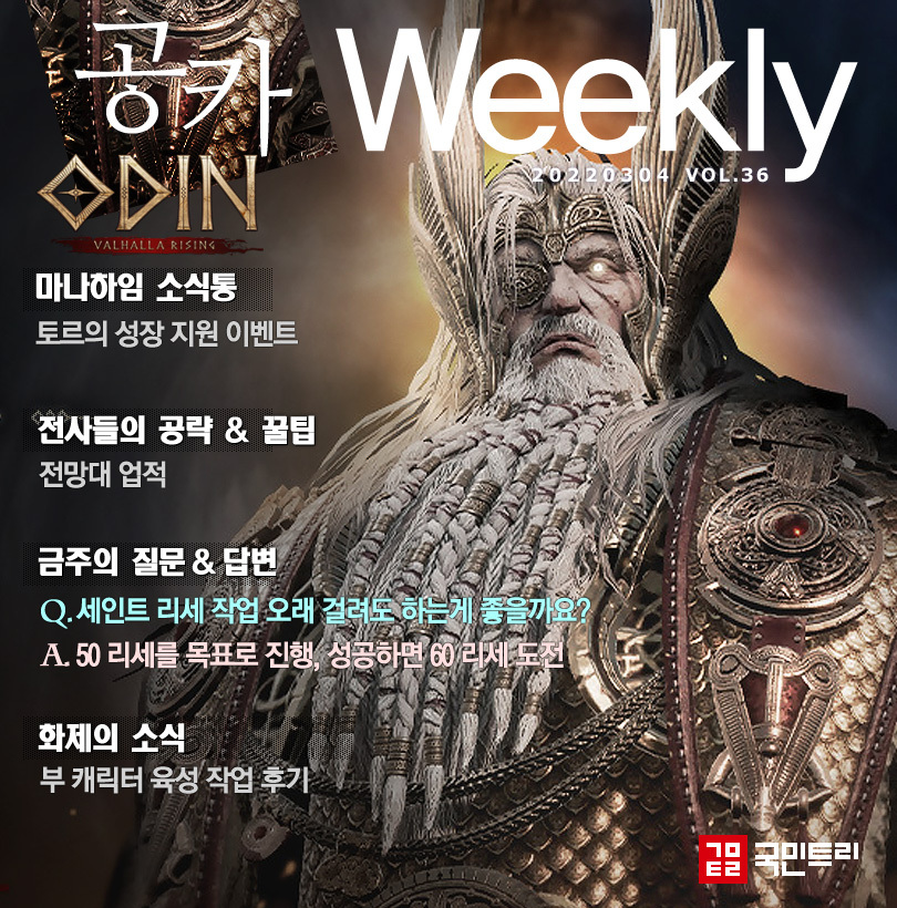 안녕하세요. ‘오딘: 발할라 라이징(이하 오딘)’ 공카 위클리 시간입니다. 이번 주 다양한 미션을 완료하면 성장에 도움 되는 아이템을 획득할 수 있는 ‘토르의 성장 지원 이벤트’가 열렸습니다. 이와 함께 오딘의 전망대 업적을 달성할 수 있게 위치를 공략한 게시글이 눈길을 끌었죠. 아울러 부캐릭터 육성 관련 질문과 첫 시도 후 소감을 남긴 유저 등이 화제였는데요, 한 주간 오딘에서 나온 주요 소식을 지금 확인해 보세요.