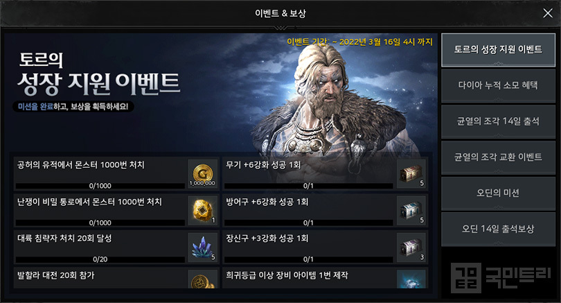2일, 정기 업데이트와 함께 ‘토르의 성장 지원 이벤트’가 시작했습니다. 16일까지 이벤트 미션을 클리어하면 다양한 보상을 획득할 수 있죠. 공허의 유적과 난쟁이의 비밀통로 몬스터 각각 1,000마리 처치, 무기/방어구 +6강화 성공 등 미션은 크게 어렵지 않습니다.