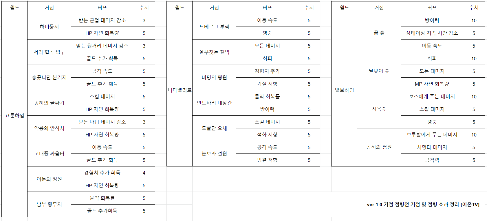표를 보시고 자신의 길드에 맞는 거점을 잘 점령하시고 버프 받으시기 바랍니다