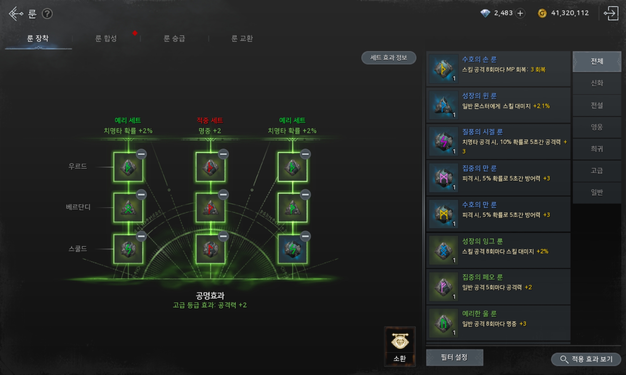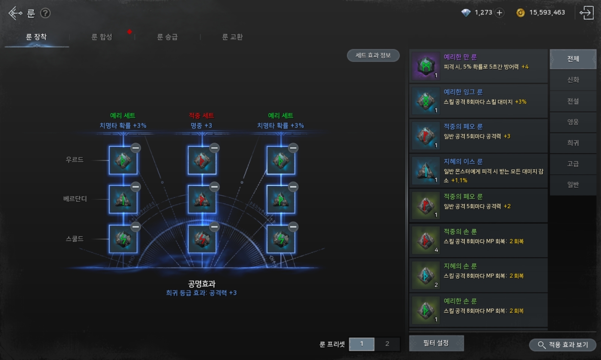 앞서 다룬 룬 부문에서 목표한 희귀셋트를 맞추기 전까지는 룬 교환석 조각 위주로 사용하고 이후 기술서를 산다