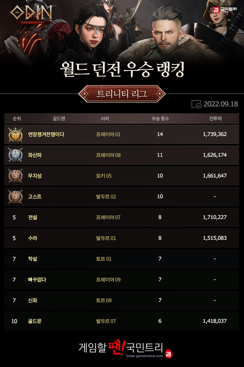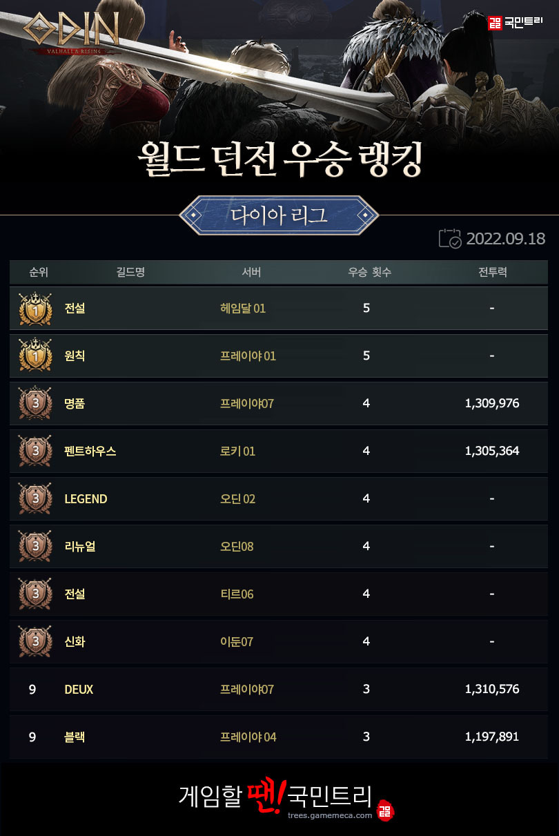 안녕하세요. ‘오딘: 발할라 라이징(이하 오딘)’ 월드 던전 랭킹 시간입니다. 시즌 43에서는 트리니티 리그 모든 서버군, 다이아 리그 7개 서버군에서 우승 길드가 가려졌습니다. 2차 서버 이전이 완전히 완료된 후 처음으로 치뤄진 월드 던전이었는데요, 각 리그 랭킹 상단에 이름을 올린 길드에 일부 변화가 발행했습니다. 금주 결과를 반영한 월드 던전 랭킹을 함께 확인해 보시죠.