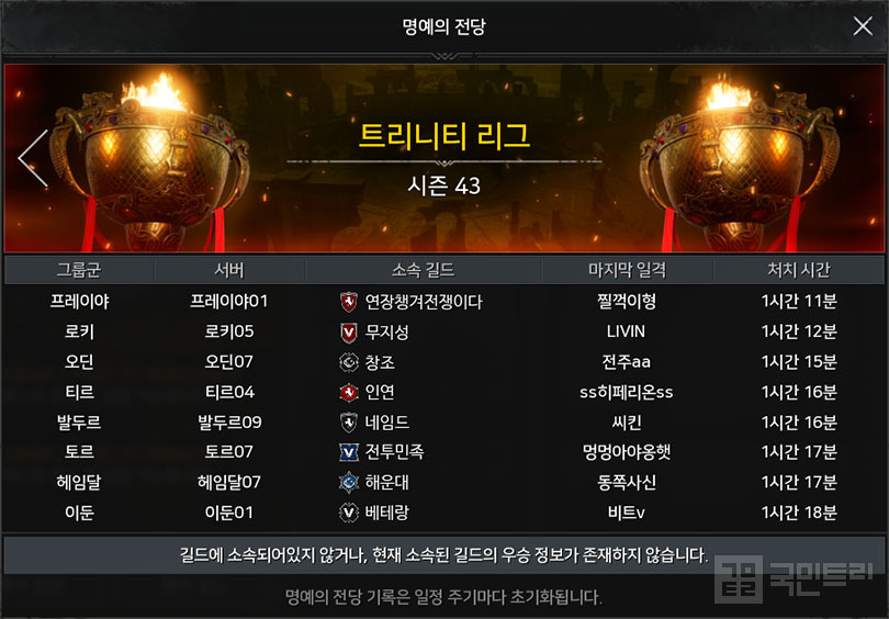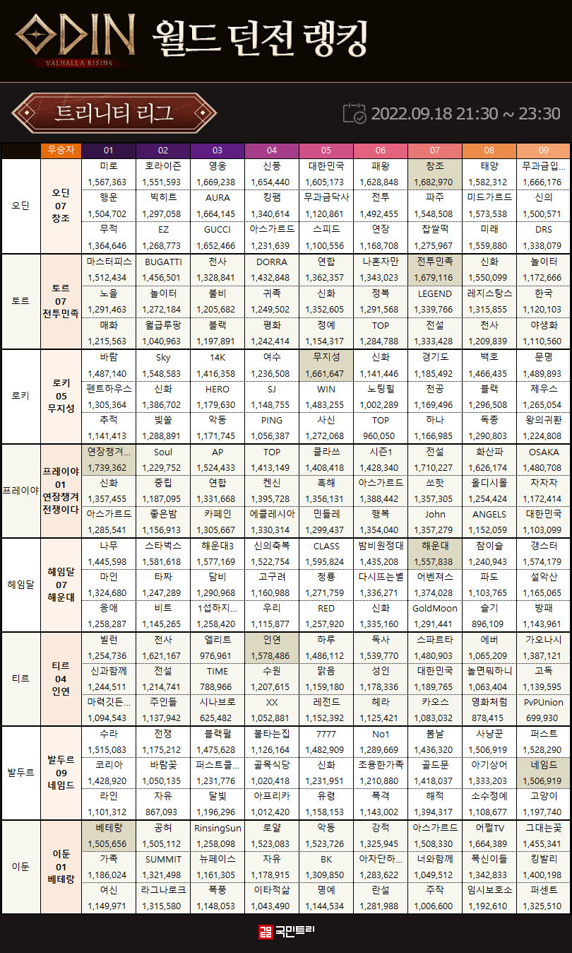 43번째 월드 던전 트리니티 리그는 모든 서버군에서 우승 길드가 탄생했습니다. 주인공은 오딘 07 창조, 토르 07 전투민족, 로키 05 무지성, 프레이야 01 연장챙겨전쟁이다, 헤임달 07 해운대, 티르 04 인연, 발두르 09 네임드, 이둔 01 베테랑 길드였습니다.