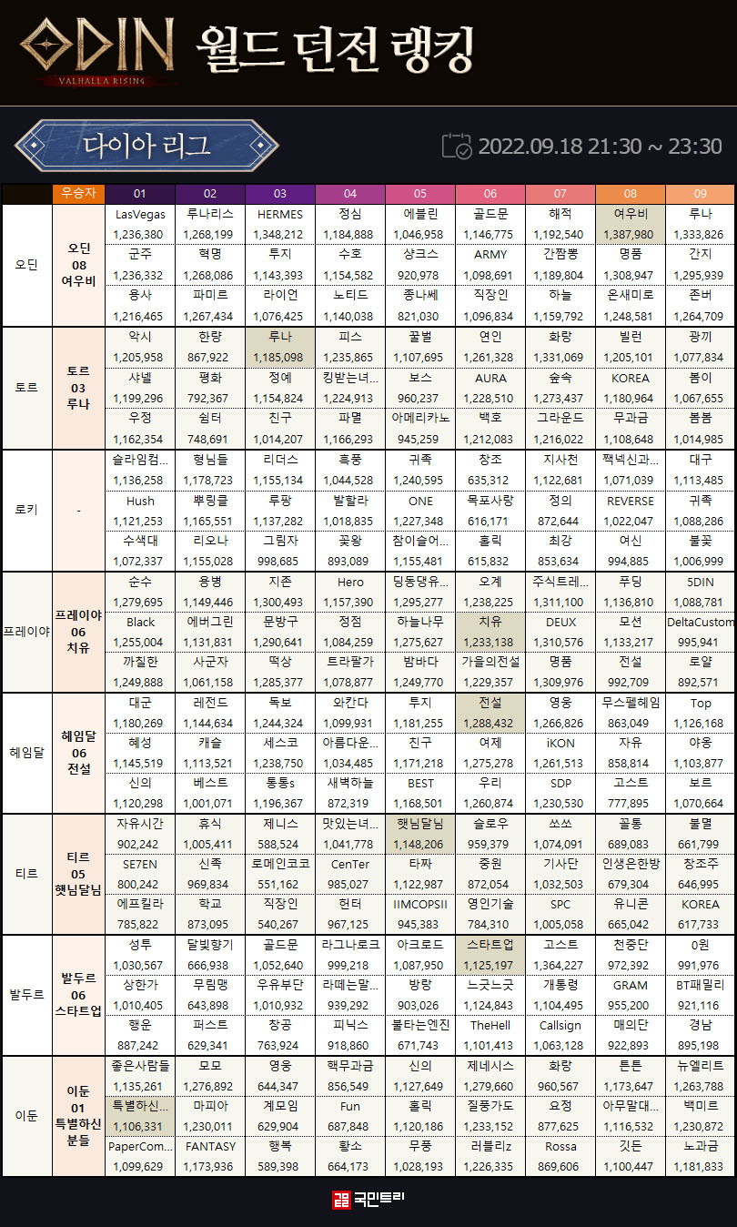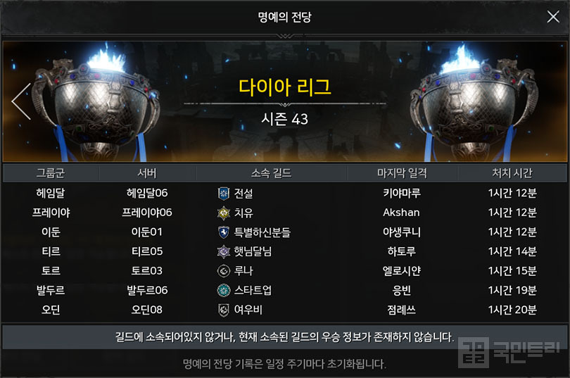 다이아 리그는 로키를 제외한 7개 서버군에서 우승 길드가 가려졌습니다. 주인공은 오딘 08 여우비, 토르 03 루나, 프레이야 06 치유, 헤임달 06 전설, 티르 05 햇님달님, 발두르 06 스타트업, 이둔 01 특별하신분들이었습니다.