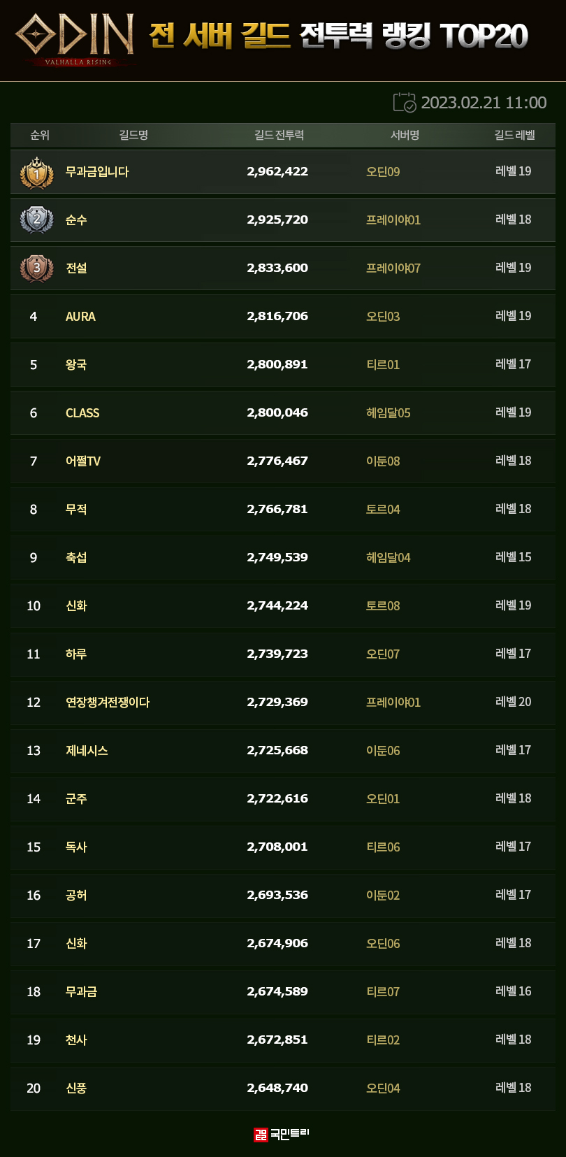길드 전투력 랭킹은 지난주에 이어 오딘 09 서버 ‘무과금입니다’ 길드가 1위에 올랐습니다. 전투력은 296만 2,422였죠. 2위는 프레이야 01 서버 ‘순수’가 차지했습니다. 지난주 5위에서 세 계단 뛰었군요. 지난주 2위였던 프레이야 01 전설 길드는 3위로 밀려났습니다.