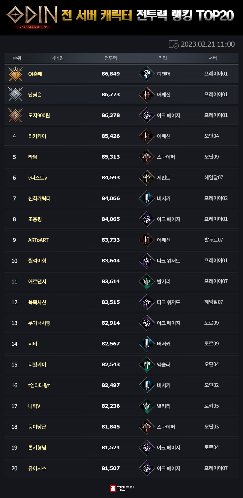 ※ 랭커 전투력, 길드 랭킹은 2월 21일 오전 11시 기준 전 서버 전투력, 길드 랭킹 정보 기준입니다.