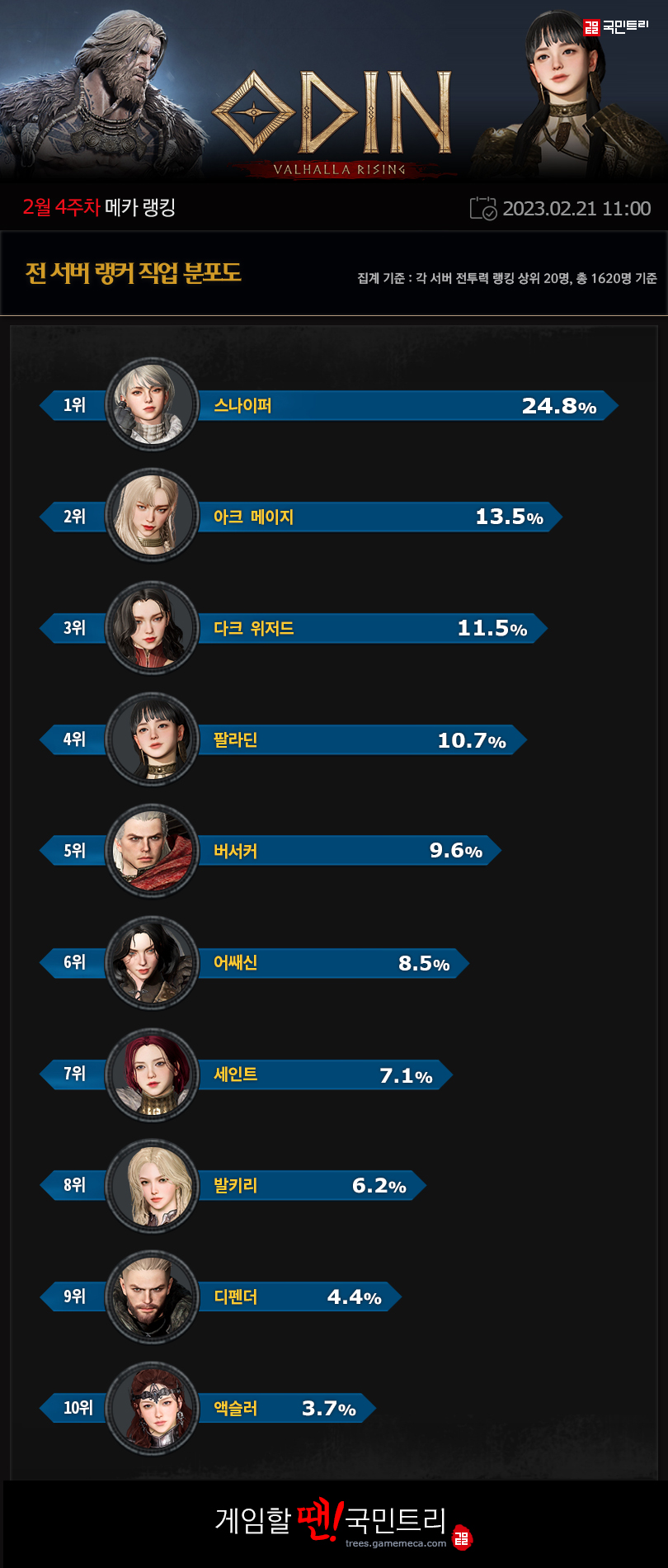 ※ 직업 분포도는 2월 21일, 오전 11시 기준 81개 서버의 각 전투력 랭킹 TOP 20, 총 1,620명 랭커 정보 기준입니다.