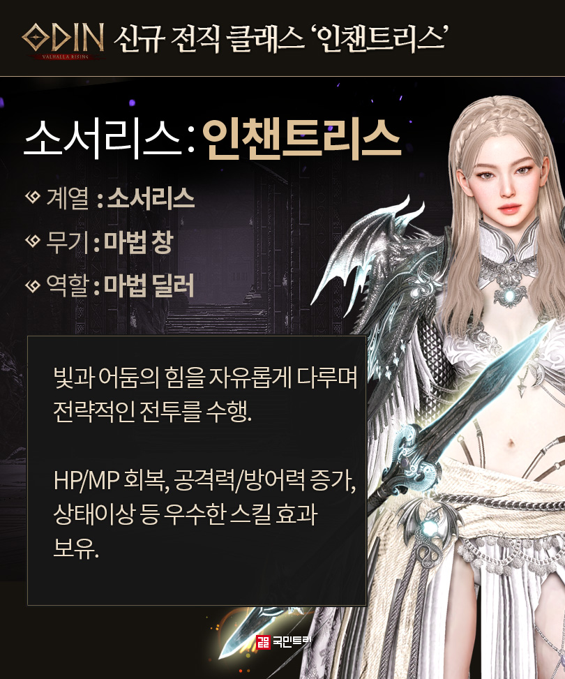 ‘오딘: 발할라 라이징’(이하 오딘)이 6월 14일에 3주년 업데이트 사전예약을 시작했다. 이와 함께 소서리스의 신규 전직 클래스 ‘인챈트리스’ 트레일러를 공개했다. 빛과 어둠의 힘을 다루며 마법 창을 무기로 쓰는 직업이다. 이전에 등장했던 전직 클래스의 트레일러에서도 인게임 특징의 힌트가 담겨있었는데, 인챈트리스 역시 주목할 만한 포인트가 눈에 띄었다. 인챈트리스가 오딘 속에서 어떤 역할을 하게 될지 영상을 통해 예측 및 분석했다.