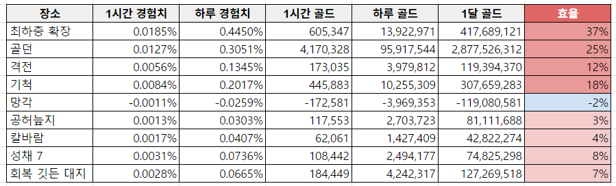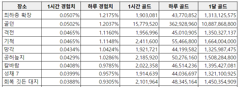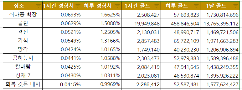 아래는 사냥터별 팔라와 다크의 레벨링, 골드 수급입니다.