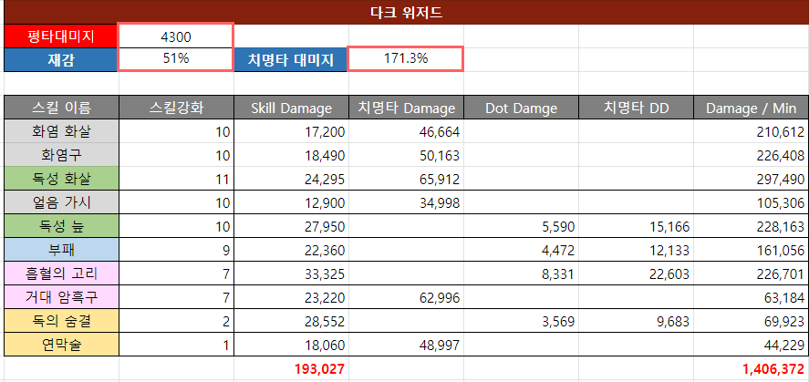 그래서 계산을 해보니 역시나 풀스킬을 1번 돌때는 다크가 대미지가 높지만,