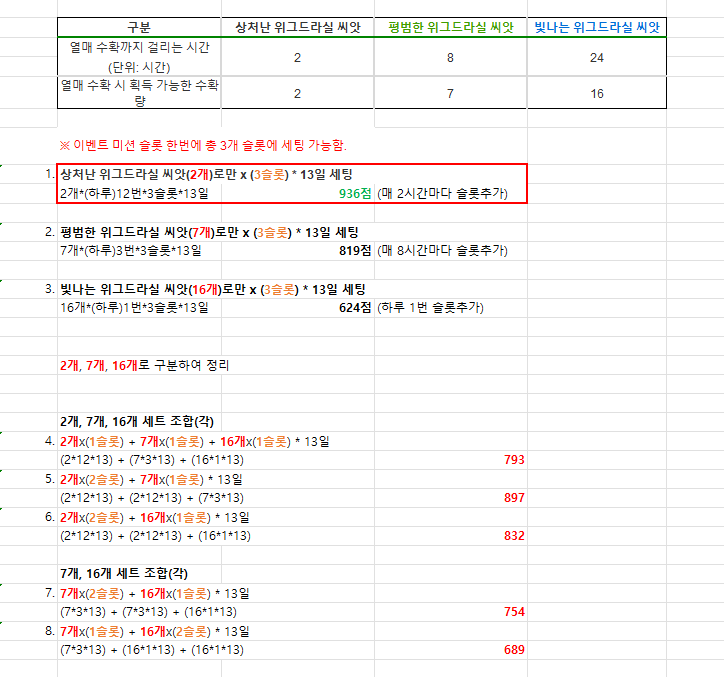 저투력(무과금)기준으로 [상처난 위그드라실 씨앗(2개짜리)]로만 3슬롯 * 13일 세팅하면,