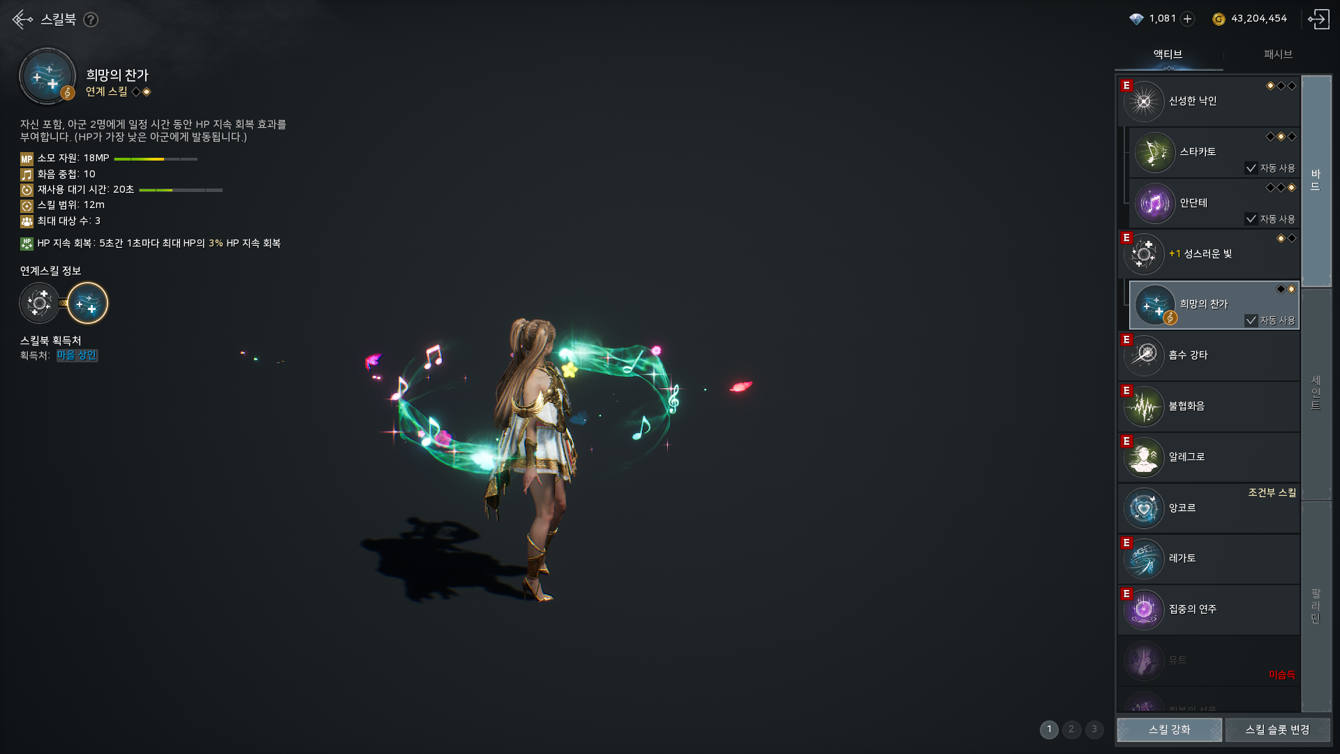 희망의 찬가는 세인트의 보호막보다 회복이라는게 좋은거같고 고렙구간때나 1대1 파티사냥할때는 생각보다 더 좋을거같아요