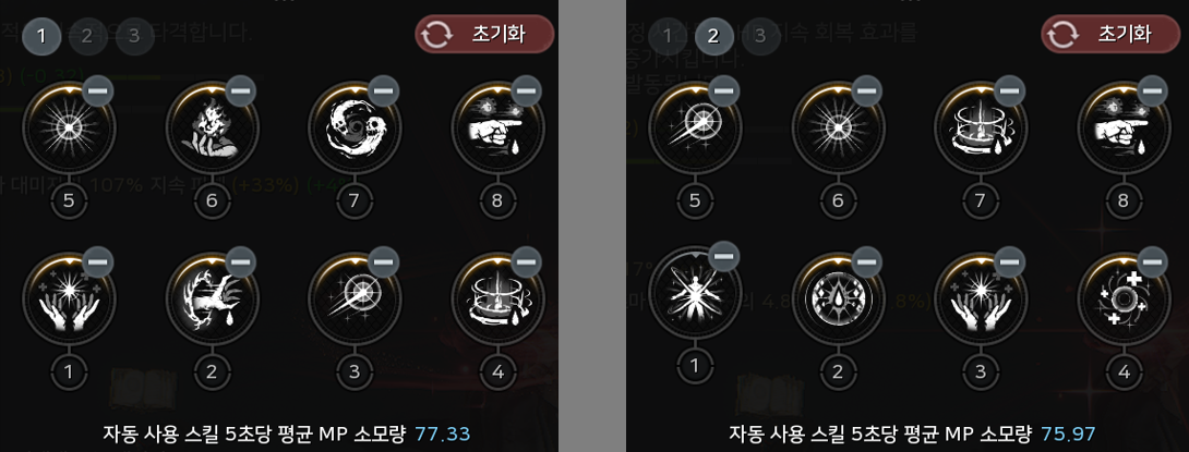 스킬프리셋 3번자리엔 1번과 2번의 중간정도인 상황에서 쓸 수 있는 스킬로 사용중입니다.