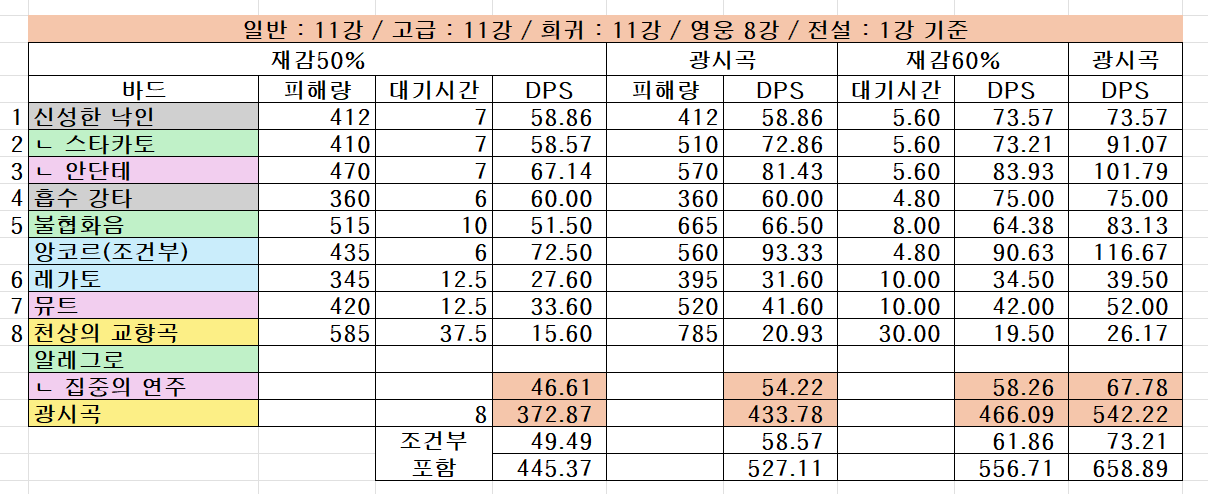 위 스샷은 바드, 새크리파이스, 인챈트리스의 스킬계수 비교입니다.