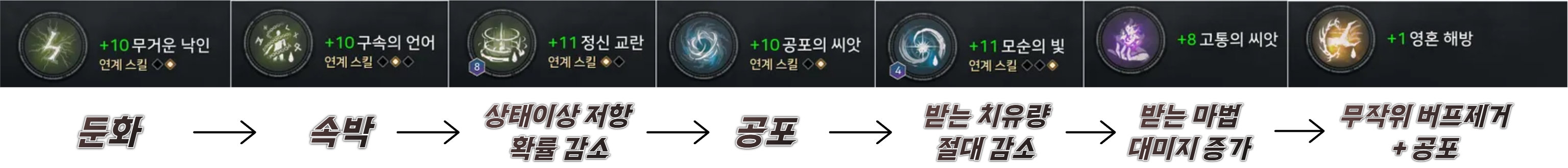 [ 둔화 / 속박 / 상태이상 저항확률 감소 / 공포 / 침묵 / 치유량 절대 감소 / 무작위버프제거 ]
