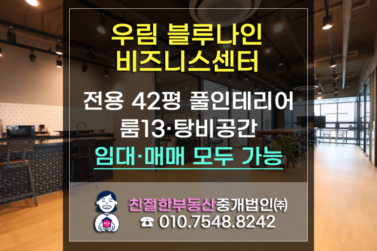 [우림블루나인비즈니스센터] 20층 전용 42평|룸13개와 탕비공간을 갖춘 풀인테리어 호실|임대와 매매 모두 가능|인더스트리얼 오픈천장·