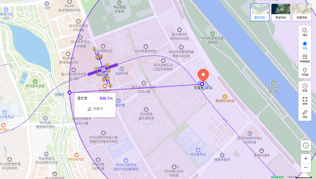 미사강변지구 인근, 아파트 단지 규모가 크고, 주거밀도가 높은 지역